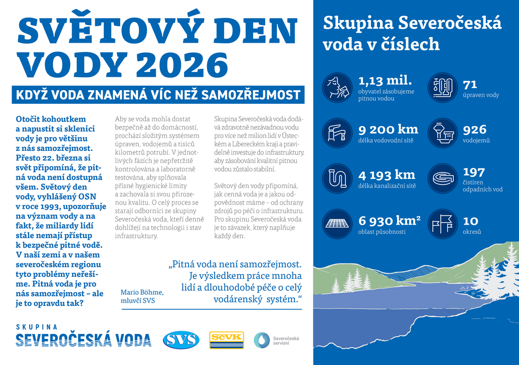 Světový den vody, vyhlášený Organizací spojených národů v roce 1993, upozorňuje na význam pitné vody a na skutečnost, že 2,1 miliardy lidí stále nemá přístup k vodě v blízkosti svého domova. V naší zemi a v našem severočeském regionu tyto problémy neřešíme. Pitná voda je pro nás samozřejmost. Ale je to opravdu tak?